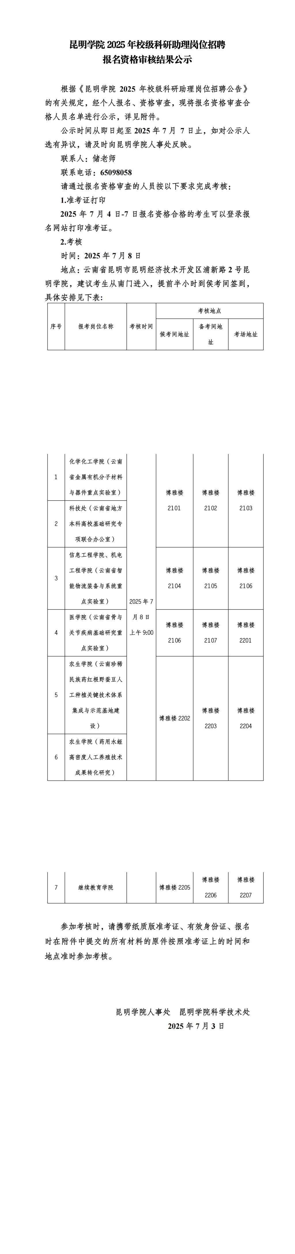 昆明学院2025年校级科研助理岗位招聘报名资格审核结果公示